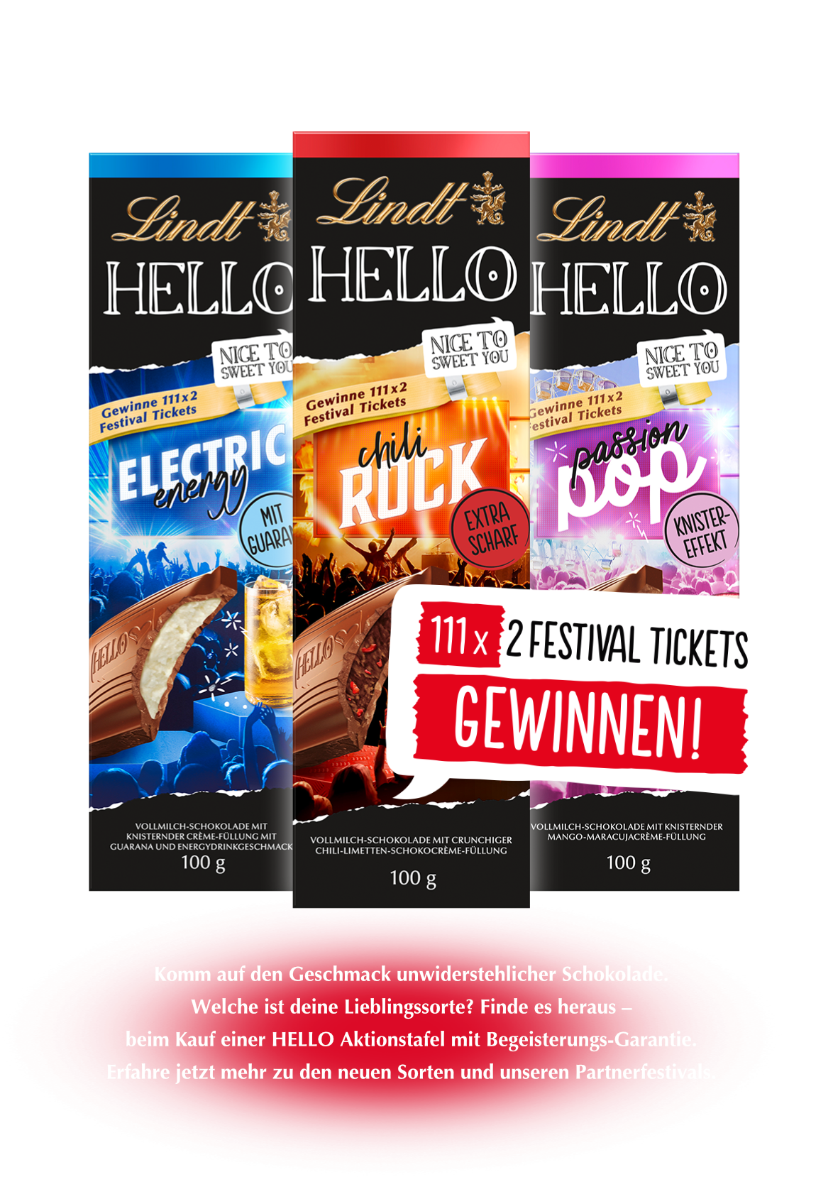 Kaufe eine der drei HELLO Aktionstafeln und genieße ein Stück. Musik in deinen Ohren? Einfach auf dieser Seite eingeben und auf „Absenden“ klicken. Wenn dein Code gewinnt, kannst du entscheiden, für welches der Festivals du 2 Tickets erhalten möchtest (Tickets sind begrenzt verfügbar). Viel Glück!